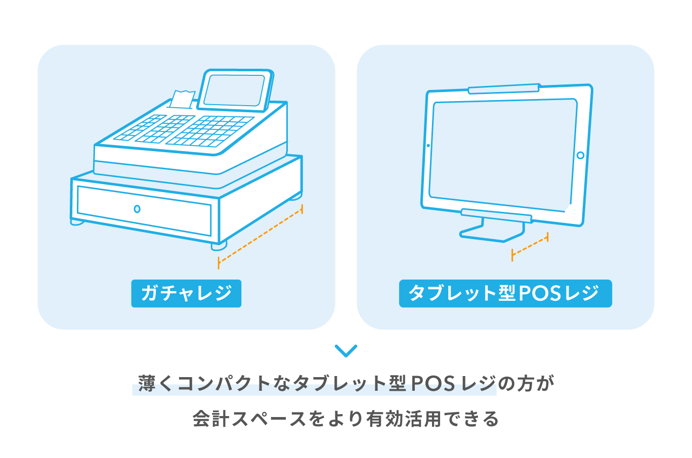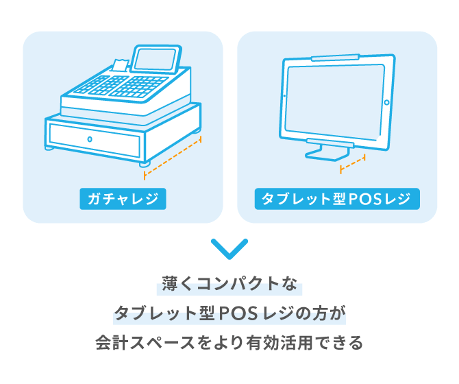 お店を始めるときは特に店舗のスペースを有効的に活用したいもの。タブレットは薄くてコンパクトなので、スペースの確保が容易です。