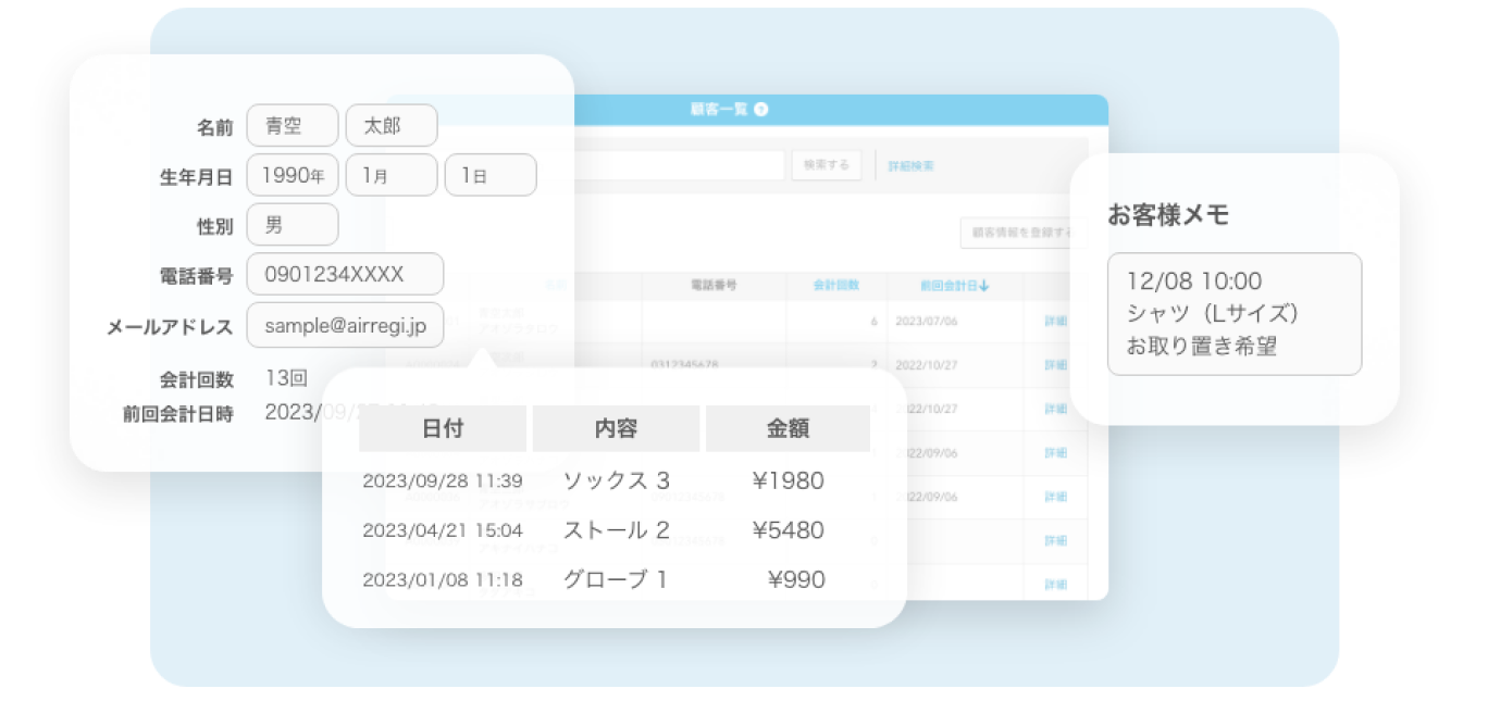 事前に登録した顧客情報と紐づけて、誰に何を売ったかを集計できます。来店周期や年間購買金額、利用サービスなどを把握することで、今後の販促活動に役立てることができます。