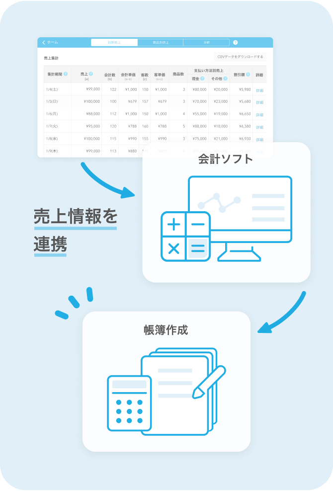 『Airレジ』で会計するだけで、売上などの数字が自動的に集計されます。売上データは、いつでもどこでも確認することができます。 -