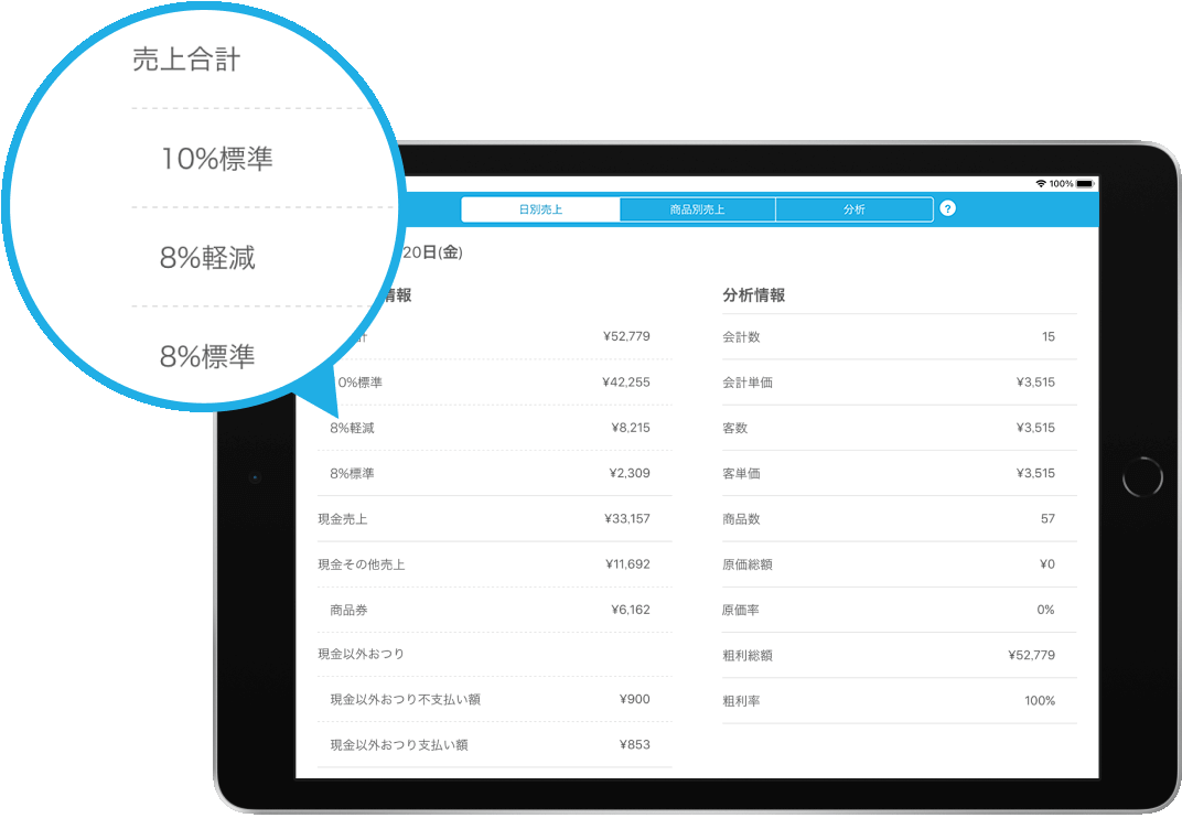 商品ごとの税率設定やイートイン/テイクアウトのお店に合わせた税率設定ができます。また税率ごとの合計金額のレシートへの印字も対応。事前の設定をするだけで複数税率への対応もカンタンにできます。