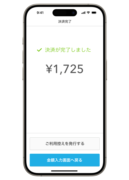 5画面に「決済が完了しました」のチェックマークが表示されると、カードの読み取りが終わって取引完了です。